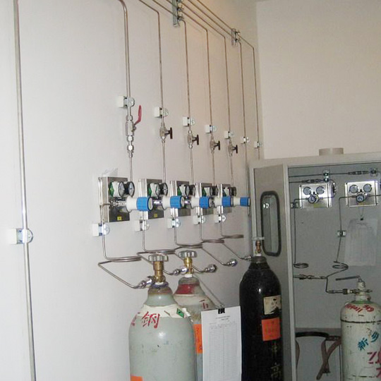 針對(duì)腐蝕性、毒性、燃燒性的氣體,通常設(shè)計(jì)將鋼瓶置于特氣柜(Gas Cabinet)內(nèi),再通過(guò)管道將氣體供應(yīng)至現(xiàn)場(chǎng)附近的閥門(mén)箱(VMB, Valve Manifold Box),而后再進(jìn)入制程機(jī)臺(tái)的使用點(diǎn)(POU, Point of Use),于進(jìn)入機(jī)臺(tái)腔體之前,會(huì)有獨(dú)立的氣體控制盤(pán)(GB, Gas Box)與制程控制模塊聯(lián)機(jī),以質(zhì)流流量計(jì)控制器(MFC, Mass Flow Controller)進(jìn)行流量之控制與進(jìn)氣的混合比例控制,通常此氣體控制盤(pán)不屬于廠務(wù)系統(tǒng)的設(shè)計(jì)范疇,而是歸屬制程機(jī)臺(tái)設(shè)備的一部份。一般的惰性氣體則是以開(kāi)放式的氣瓶架(Gas Rack)與閥門(mén)盤(pán)(VMP, Valve Manifold Panel)進(jìn)行供應(yīng)。